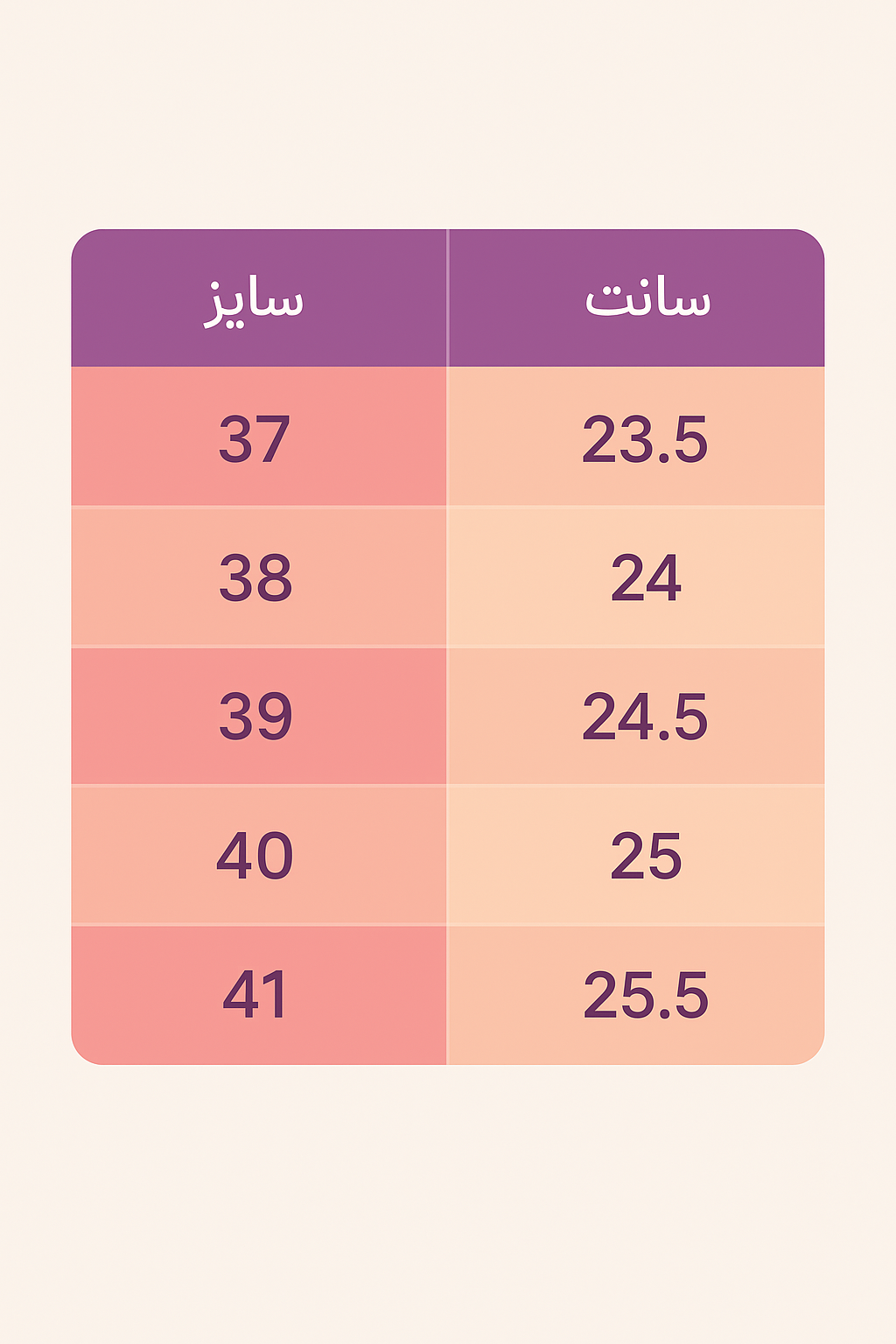 لطفا قبل از انتخاب سایز(از بلندترین انگشت تا پاشنه پا )با متر فلزی یا خط کش اندازه گرفته و با جدول سایز بندی چک کنید🙏🏻